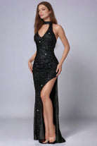 تُسحر هذه الفستان المسائي الطويل بترترها المتلألئ وشقها العالي الجريء. يبرز خط العنق على شكل V وهيكله المحدد القوام بشكل أنيق. قطعة ساحرة مصممة لتتألقي في جميع أمسياتك الاستثنائية.