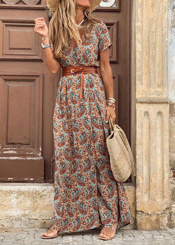 Questo abito lungo bohemien presenta delicati motivi floreali e una silhouette fluida. Il suo scollo a V e le maniche corte offrono un aspetto femminile e confortevole. Perfetto per le giornate di sole, unisce stile e comodità.