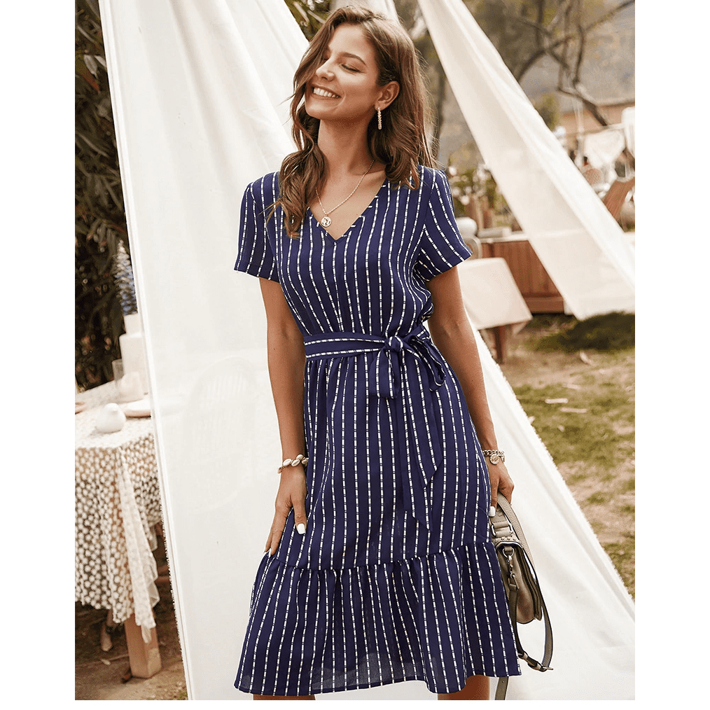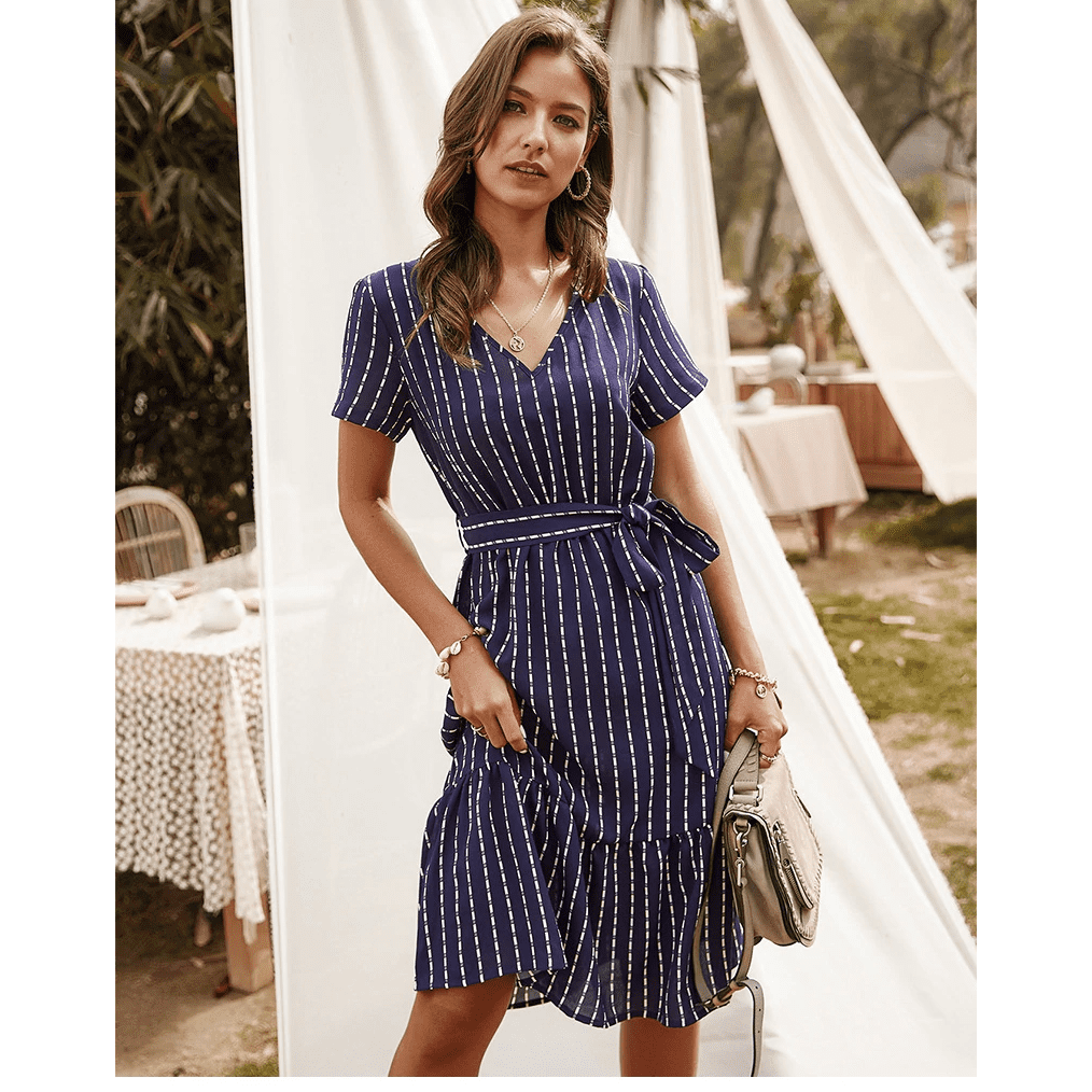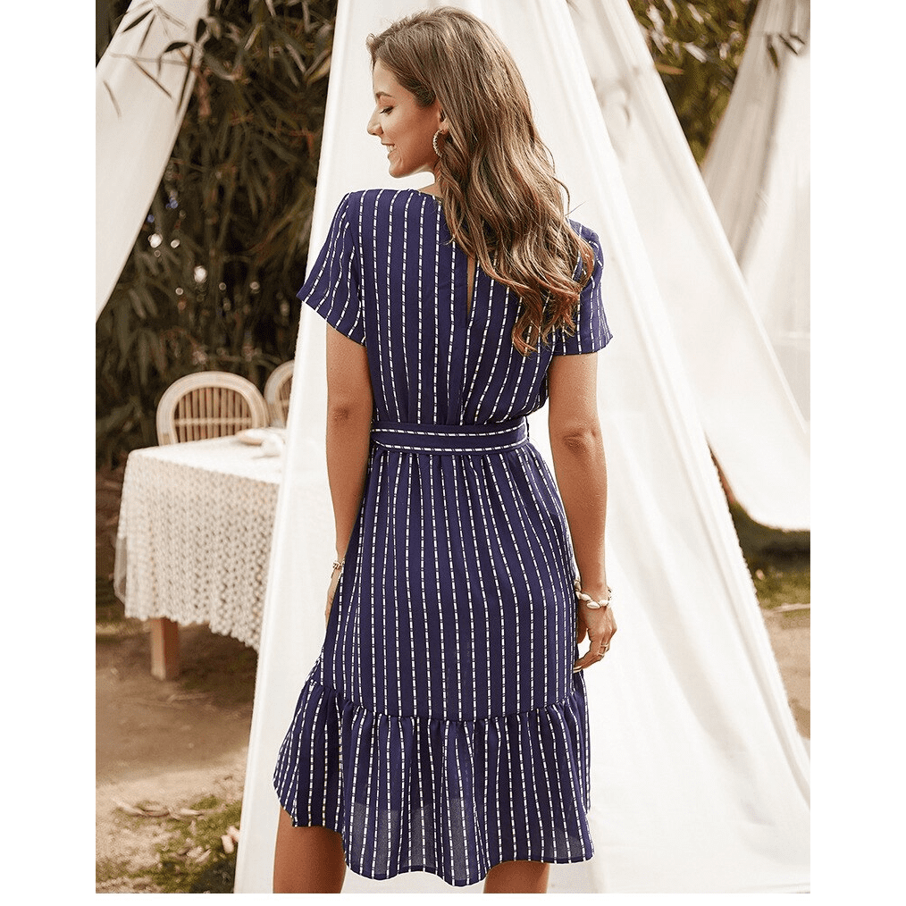 Con la sua tonalità blu navy, il colletto a V e la cintura annodata, questo abito corto riflette perfettamente lo spirito hippie chic. La sua silhouette asimmetrica aggiunge un tocco delicatamente moderno. Ideale per una serata romantica o una fuga estiva.