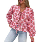 Diese Bluse hat eine feminine Silhouette und ein charmantes Blumenmuster. Ihr Design mit langen Ärmeln und ihrem einzigartigen Kragen verleiht einen Hauch von Eleganz. Perfekt für lässige Anlässe, vereint sie Stil und Komfort.