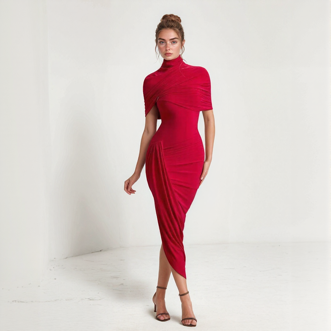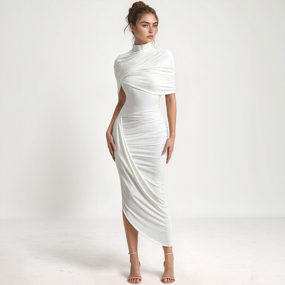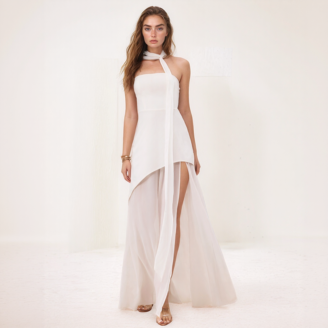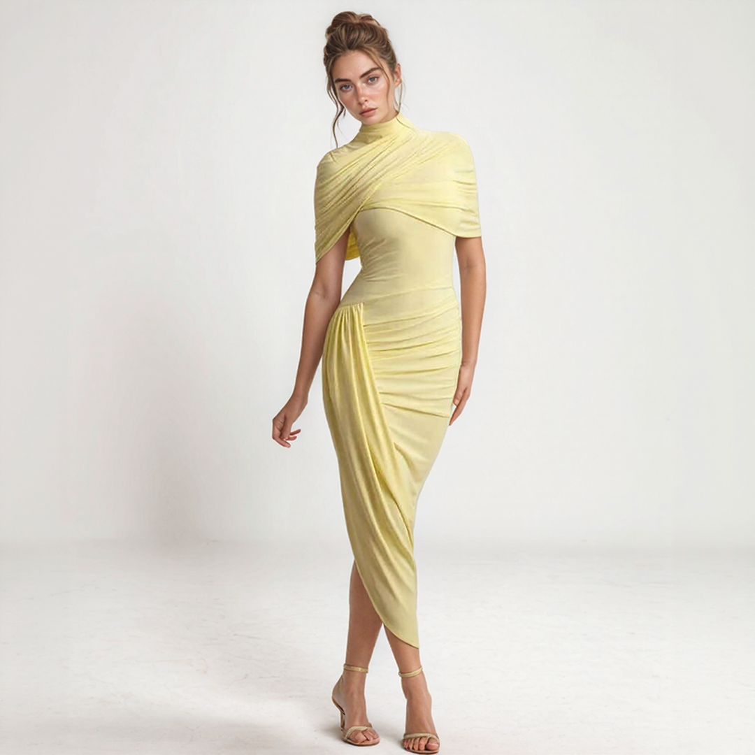 Νέλλυ | Μακριά Κομψή Φόρεμα – Ασύμμετρη Κοπής και Ενσωματωμένο Φουλάρι