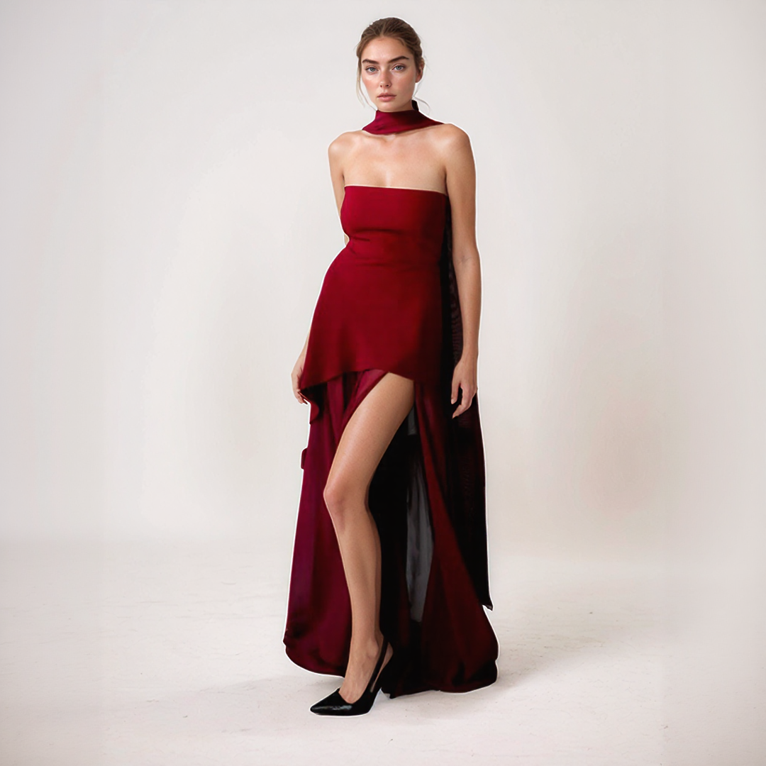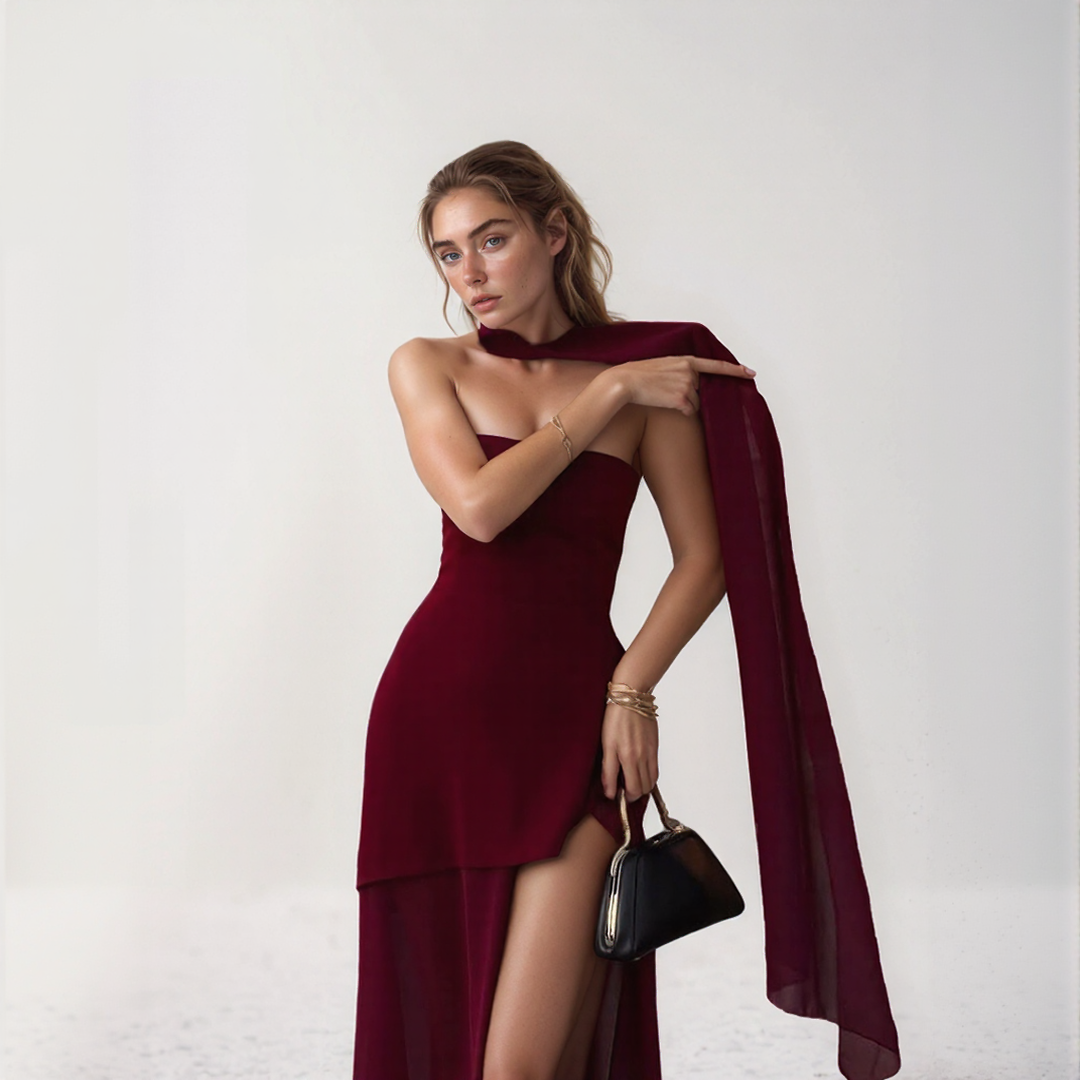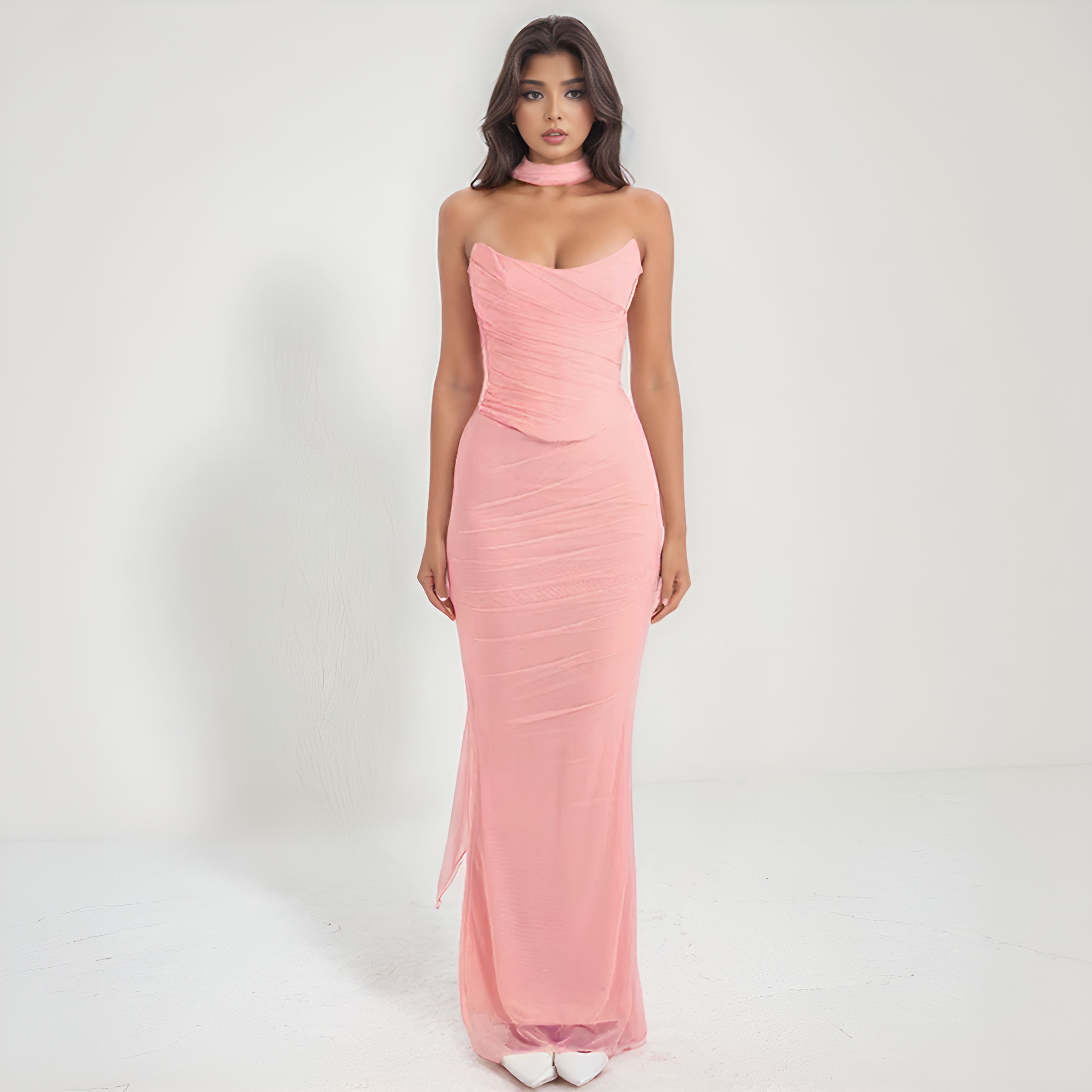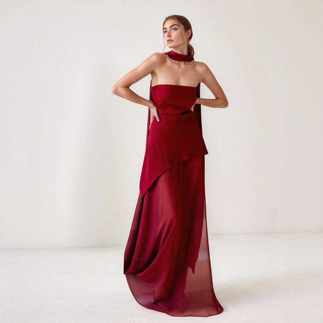 Πέρι | Μακριά Φόρεμα Δύο Τεμαχίων – Κομψότητα Χωρίς Τιράντες Και Συντονισμένο Μαντήλι