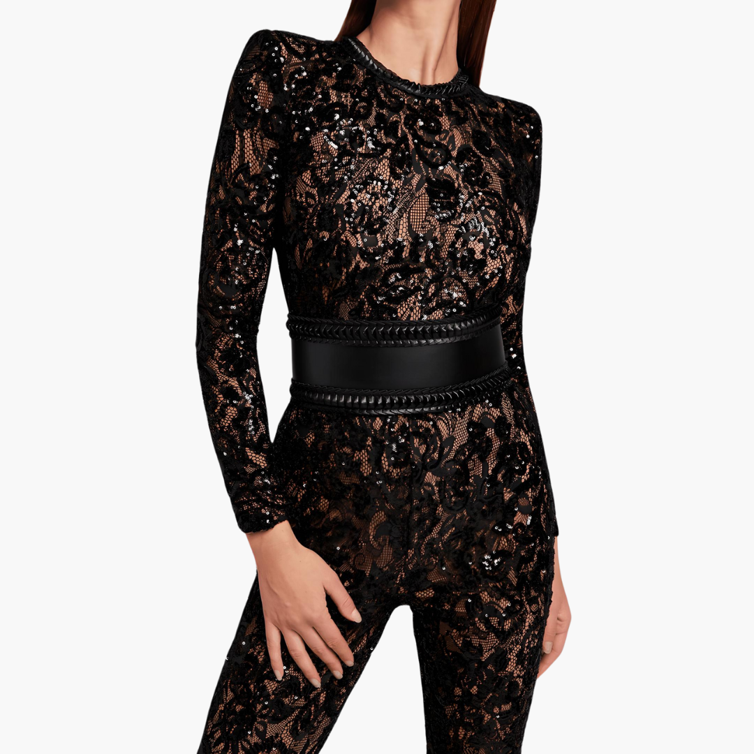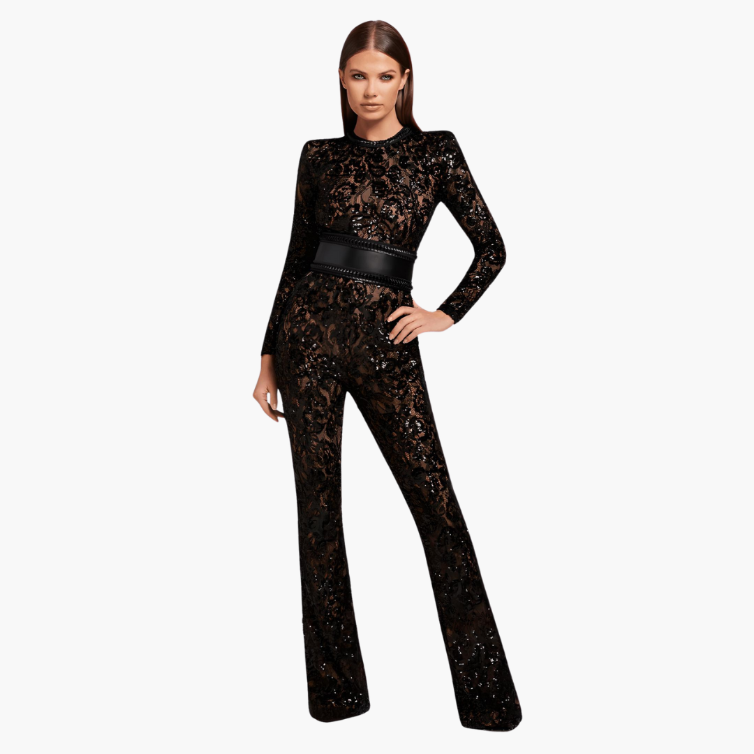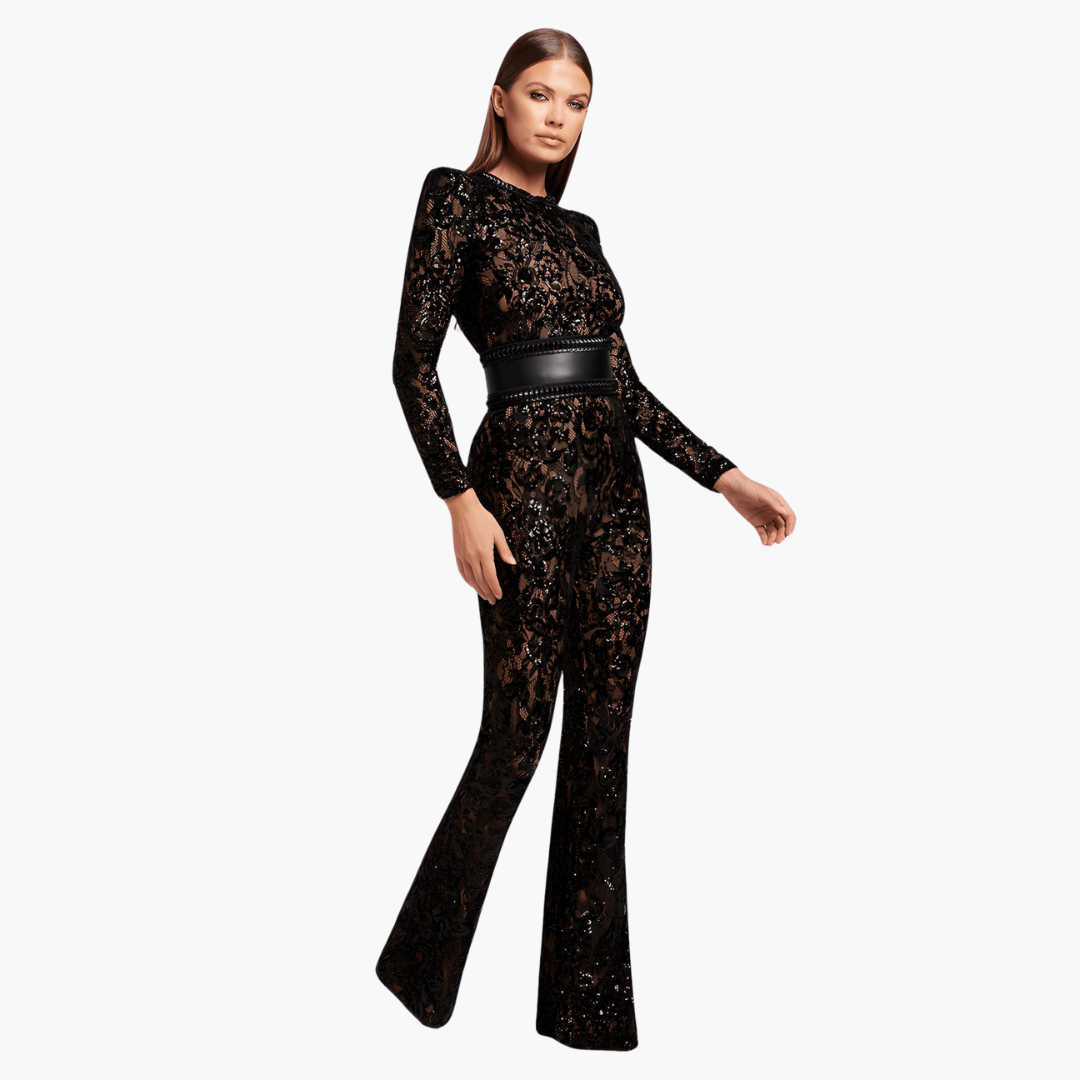 Tämä pitkä haalari ilmentää hienostunutta ja modernia ilmettä. Pitkine hihoineen, levenevine lahkeineen ja kankaineen se korostaa siluettia tuoden samalla hienovaraisen naisellisuuden kosketuksen. Täydellinen päivittäisten tai iltatilaisuuksien asujen korostamiseen.
