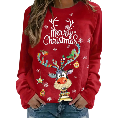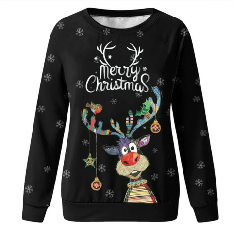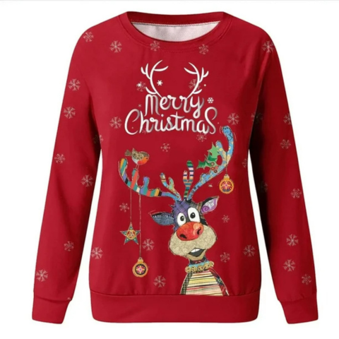 Ez a pulóver egy vidám és színes stílusban illusztrált rénszarvast emel ki. A hópelyhek és díszítések vizuális érintést adnak, ami a szezon meleg szellemiségére emlékeztet. Könnyen viselhető a mindennapokban, játékos elemet ad minden év végi öltözethez.
