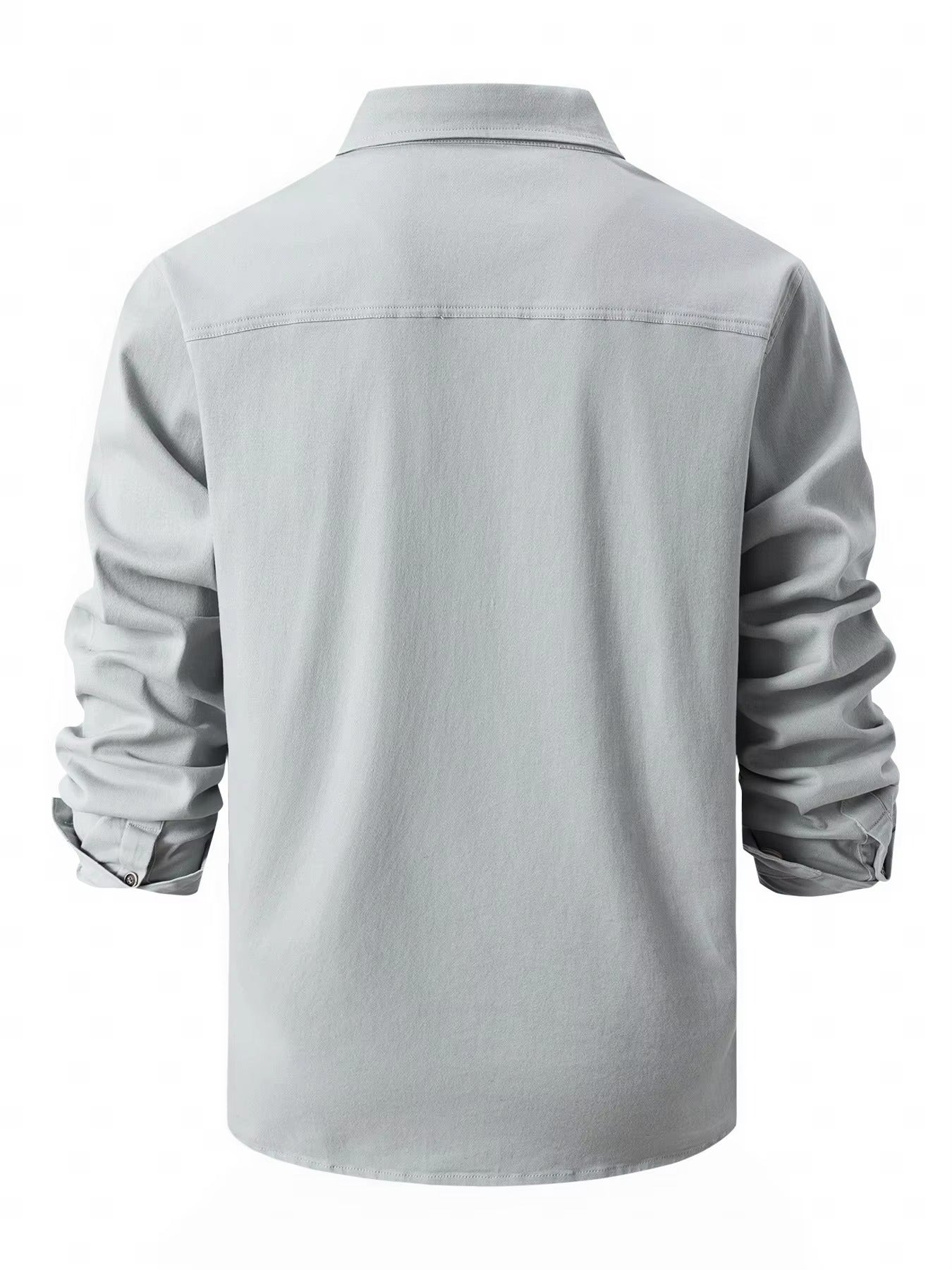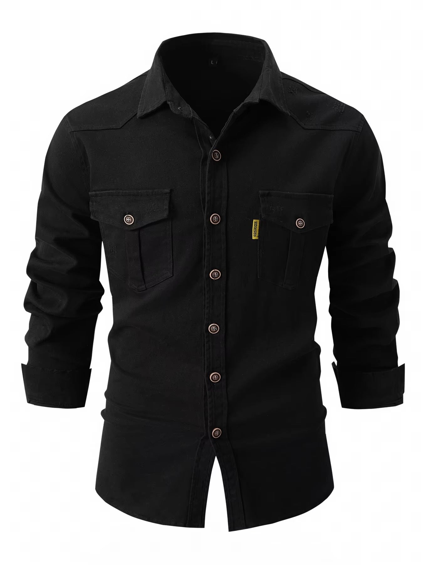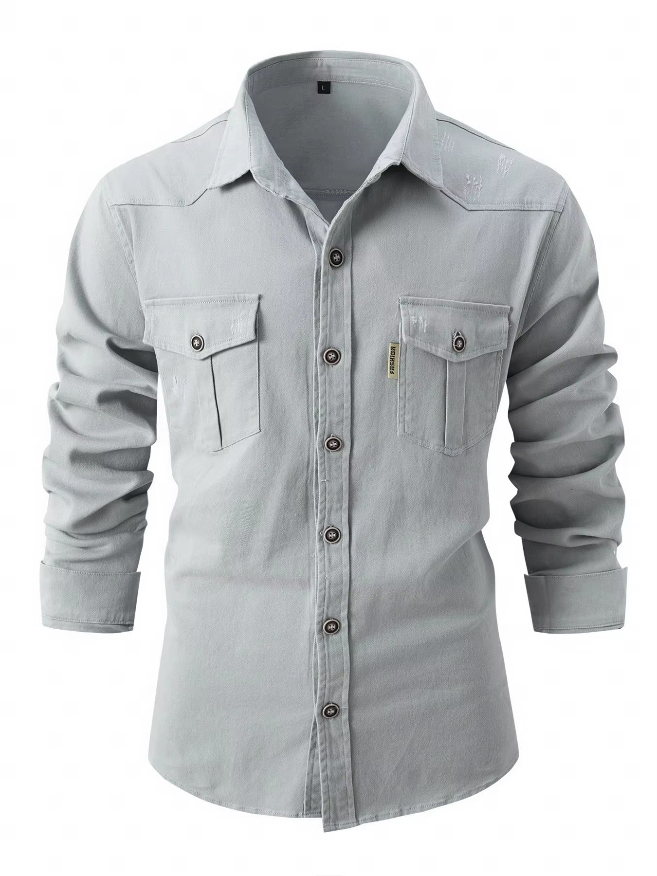 Táto košeľa s dlhým rukávom je vyrobená z denimu s kontrastnými odtieňmi. Má klasický preložený golier a centrálny gombíkový pás, čo poskytuje štýl, ktorý je zároveň štruktúrovaný a neformálny. Vrecká s klopou na hrudi pridávajú funkčnú dimenziu. Jej čistý strih je vhodný na rôzne príležitosti, od každodenných po formálnejšie výstupy.