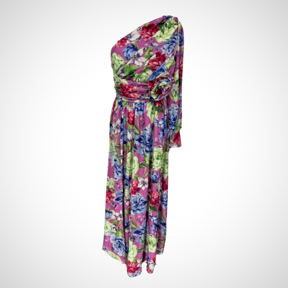 Denna asymmetriska långklänning avslöjar axeln med subtilitet och högt. Dess flödande fåll och lätta tyg säkerställer optimal komfort, även i varmt väder. Perfekt för en elegant och djärv look på sommaren.